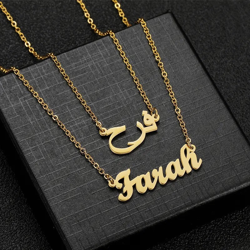 The necklace is composed of the name translated in Arabic at the top and in Spanish at the bottom.